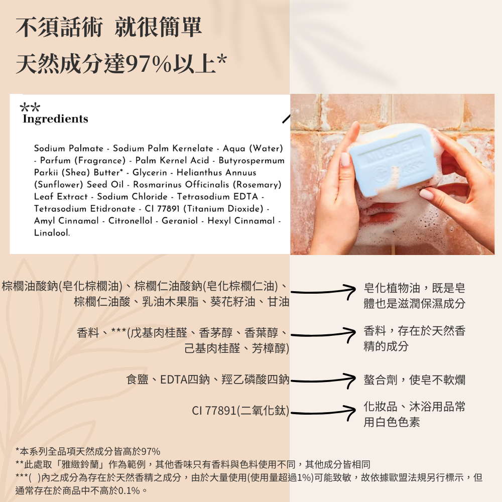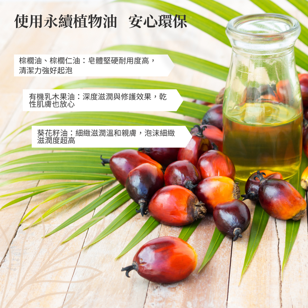成 分:皂化棕櫚油、皂化棕櫚仁油、水、香料、棕櫚仁油酸、有機乳油木果脂、甘油、葵花籽油、迷迭香萃取物、食鹽、食用色素等,全成分請參考包裝說明